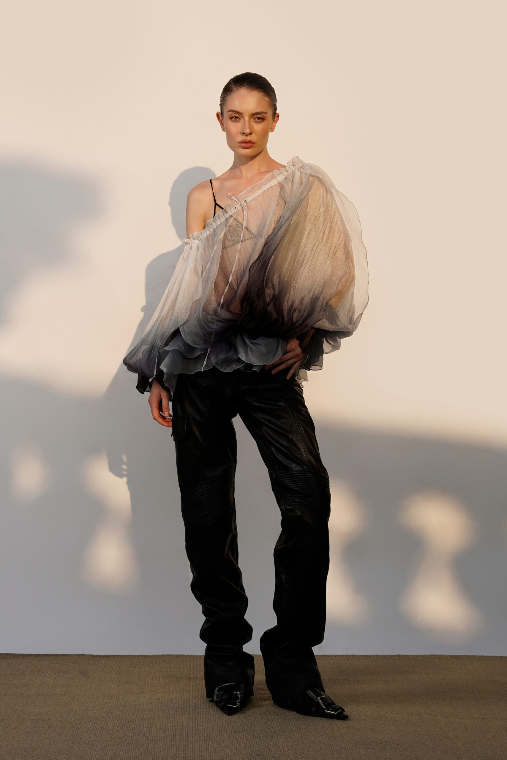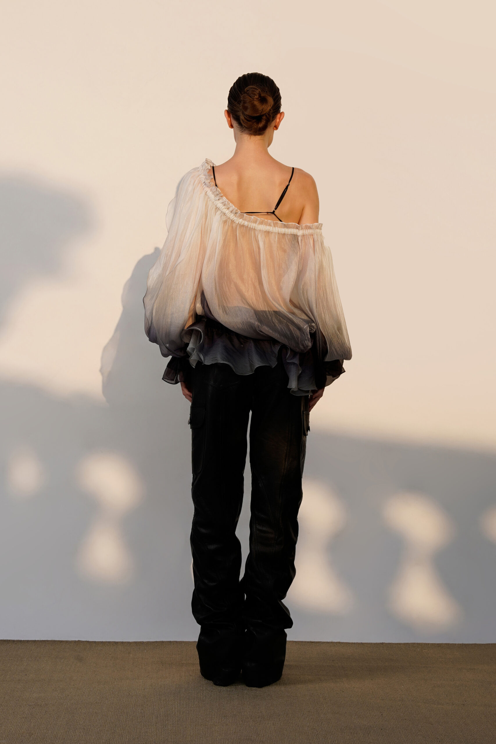 – Rose-inspired layers – Off-shoulder – Long sleeves