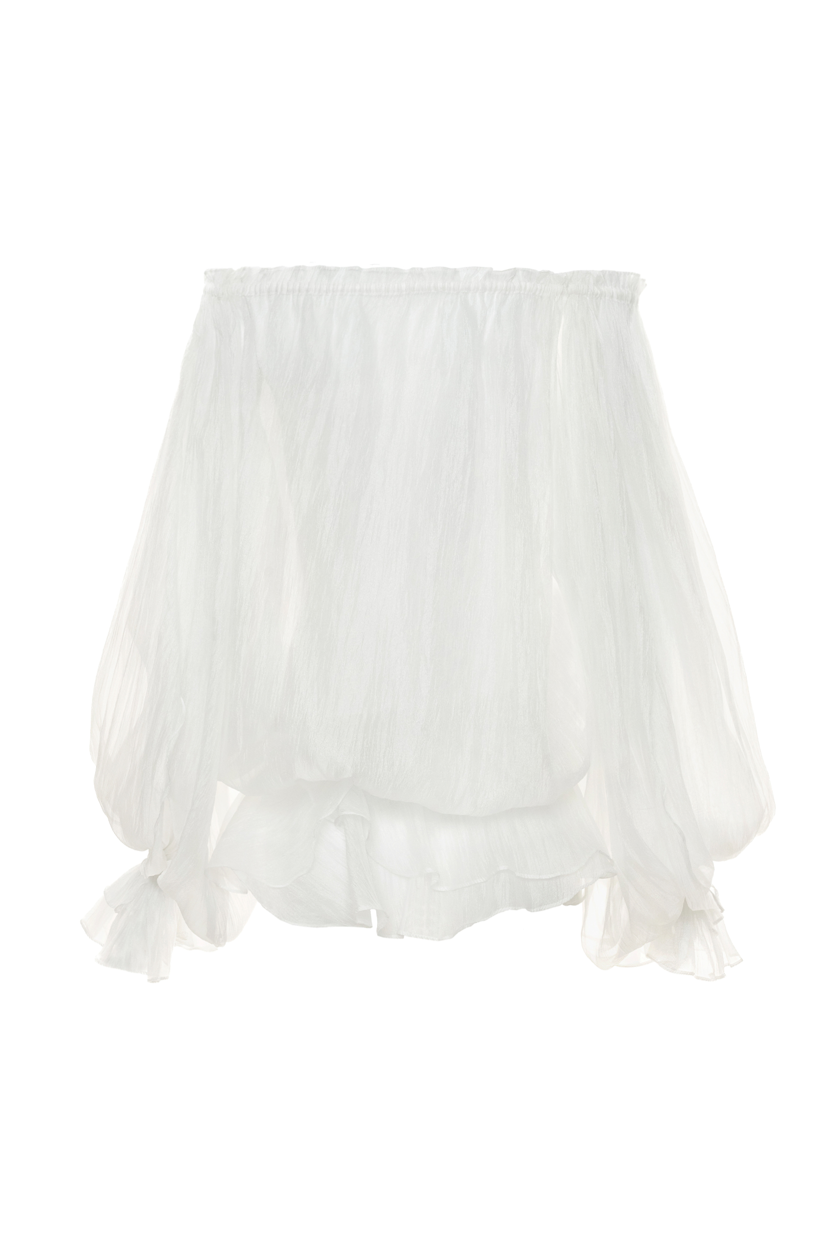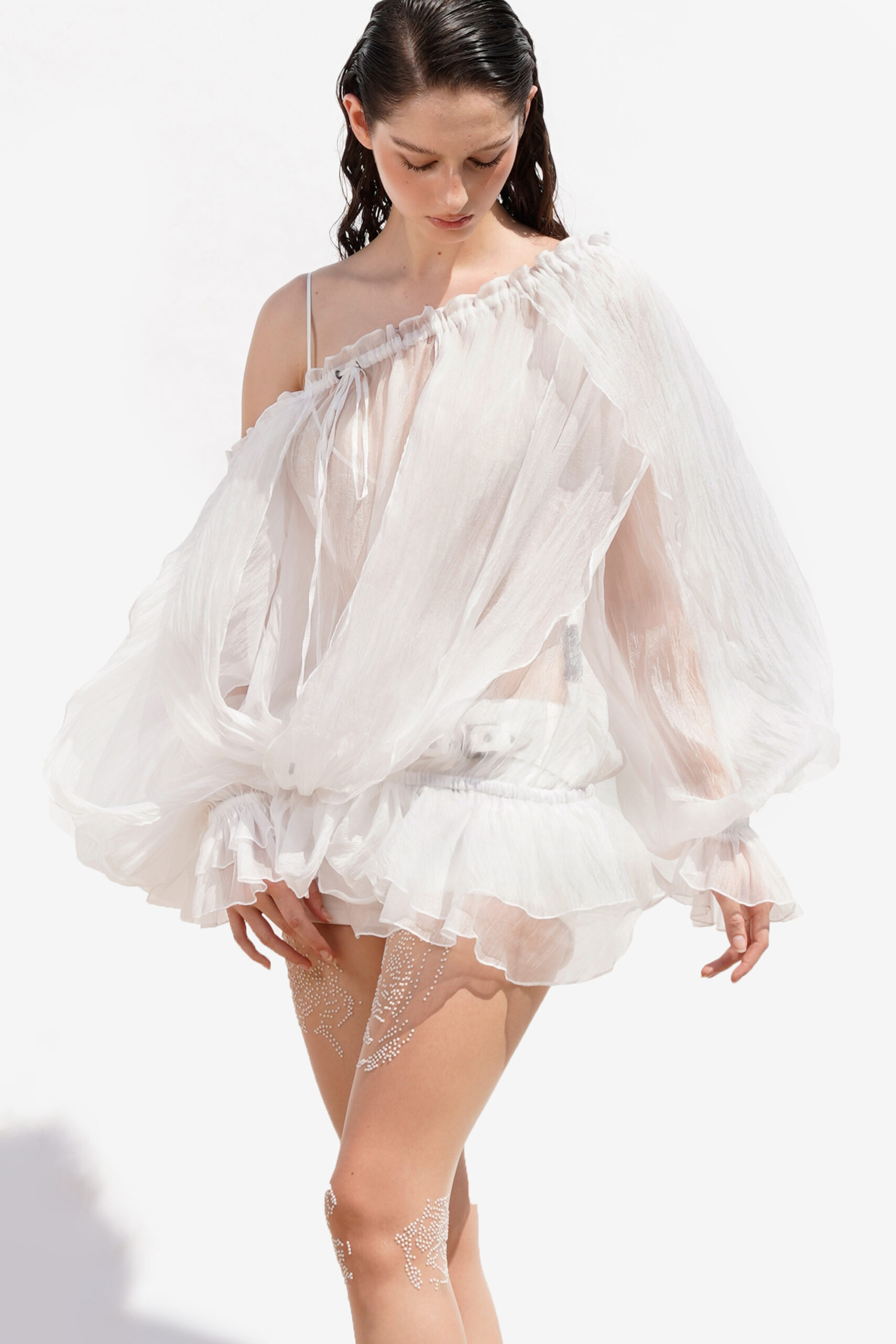 – Rose-inspired layers – Off-shoulder – Long sleeves